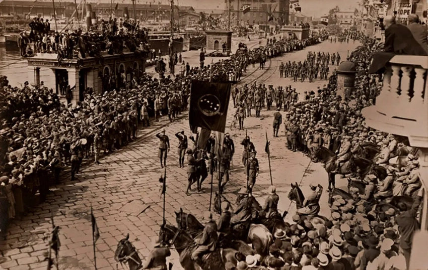 Надо еще добавить, что при всей каше, которая бродила в голове д’Аннунцио, он был реальным националистом и реваншистом. Кстати, именно он ввел практику приветствовать солдат, возвращавшихся с войны, старым римским приветствием легионеров. Тем самым, «от сердца к солнцу». Доказательств, что легионеры так приветствовали друг друга, нет, но если очень хочется, то можно, сами знаете.