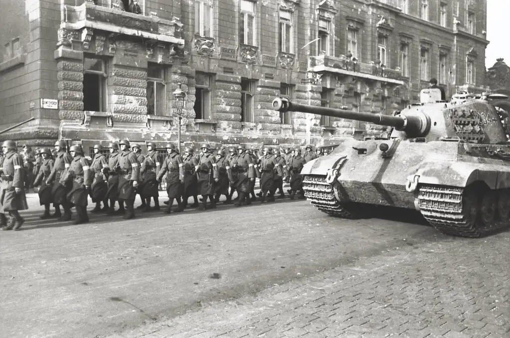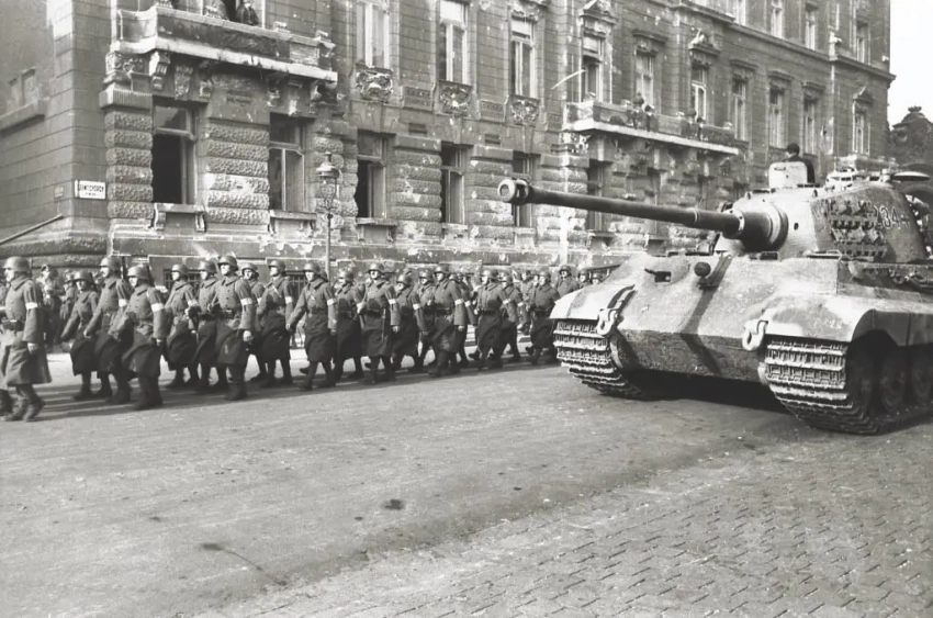 Немецкий танк и подразделение Скрещенных стрел на улице Будапешта
