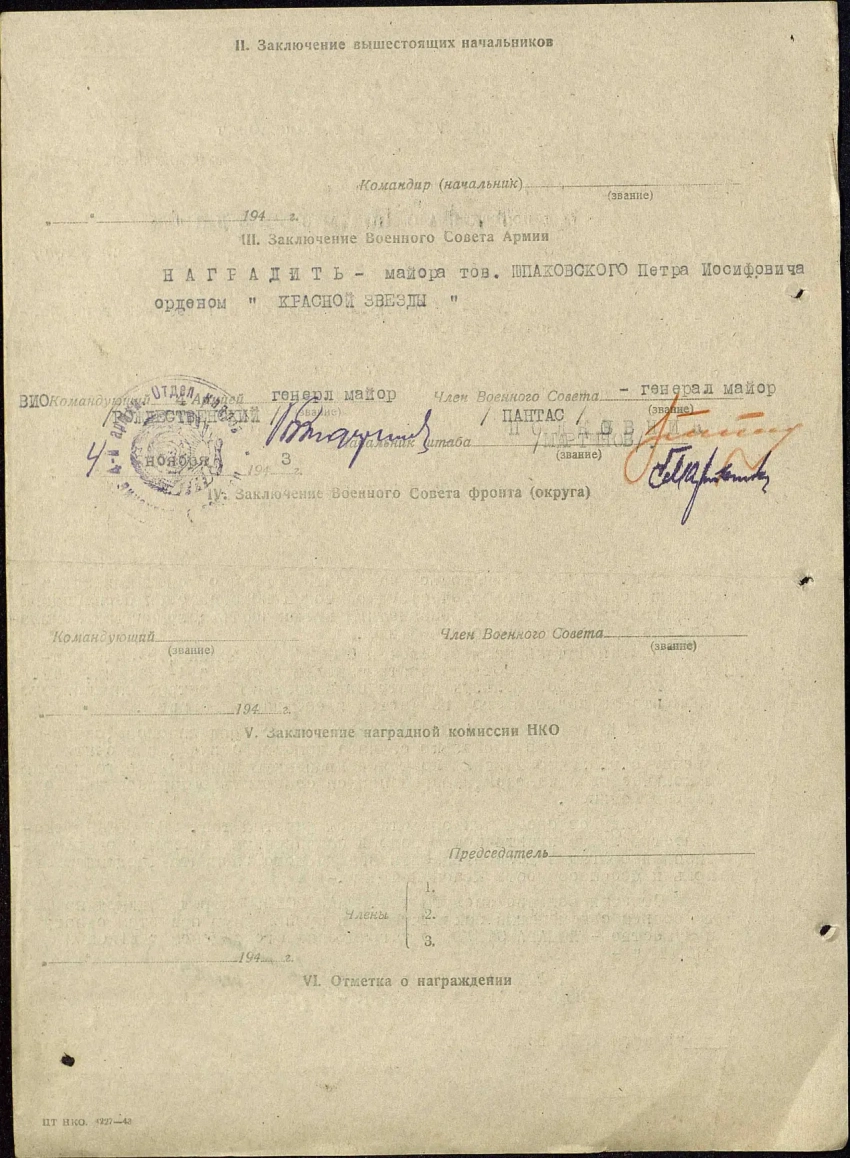 Отмечая большие заслуги тов. ШПАКОВСКОГО перед Родиной на фронте борьбы с немецкими захватчиками и проявленную при этом отвагу и мужество – ХОДАТАЙСТВУЮ о награждении его орденом «КРАСНОЙ ЗВЕЗДЫ».