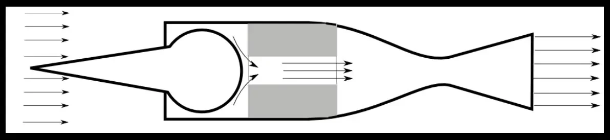 Процесс прост и совершенно не изменился за последние сто лет. В двигатель поступает воздух со скоростью полета аппарата, на входе в камеру сгорания воздух механически максимально замедляется, что вызывает возрастание давления и температуры. Далее поток сужается в сопле, рабочее тело достигает звуковой скорости, а вновь при расширении на выходе – сверхзвуковой. За счет того, что рабочее тело движется со скоростью, превышающей скорость встречного потока, внутри создается реактивная тяга. Всё очень просто и даже примитивно.
