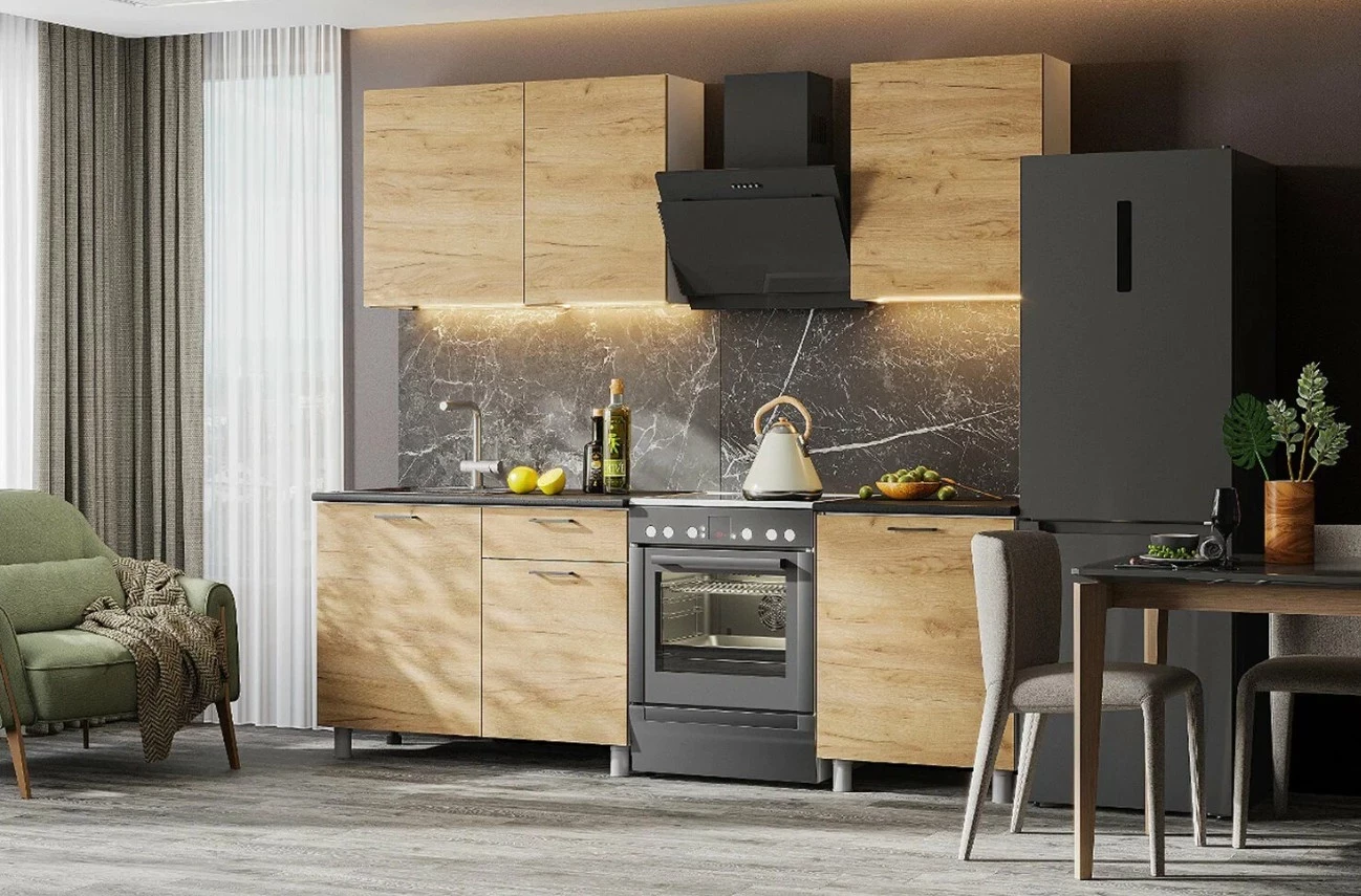Кухонный гарнитур от Hoff в цвете дуб золотой — это практичный и эстетичный вариант для тех, кто ищет продуманное решение в среднем ценовом сегменте. В рейтинг мебели для кухни этот комплект заслуженно попадает благодаря сбалансированному сочетанию функциональности и визуальной выразительности. Он включает четыре ключевых модуля и столешницу, что позволяет быстро обустроить компактную кухню без лишней суеты. Высокие навесные шкафы обеспечивают максимум полезного пространства, а нижние столы удобны в повседневной эксплуатации. Отличный выбор для квартир с ограниченной площадью.