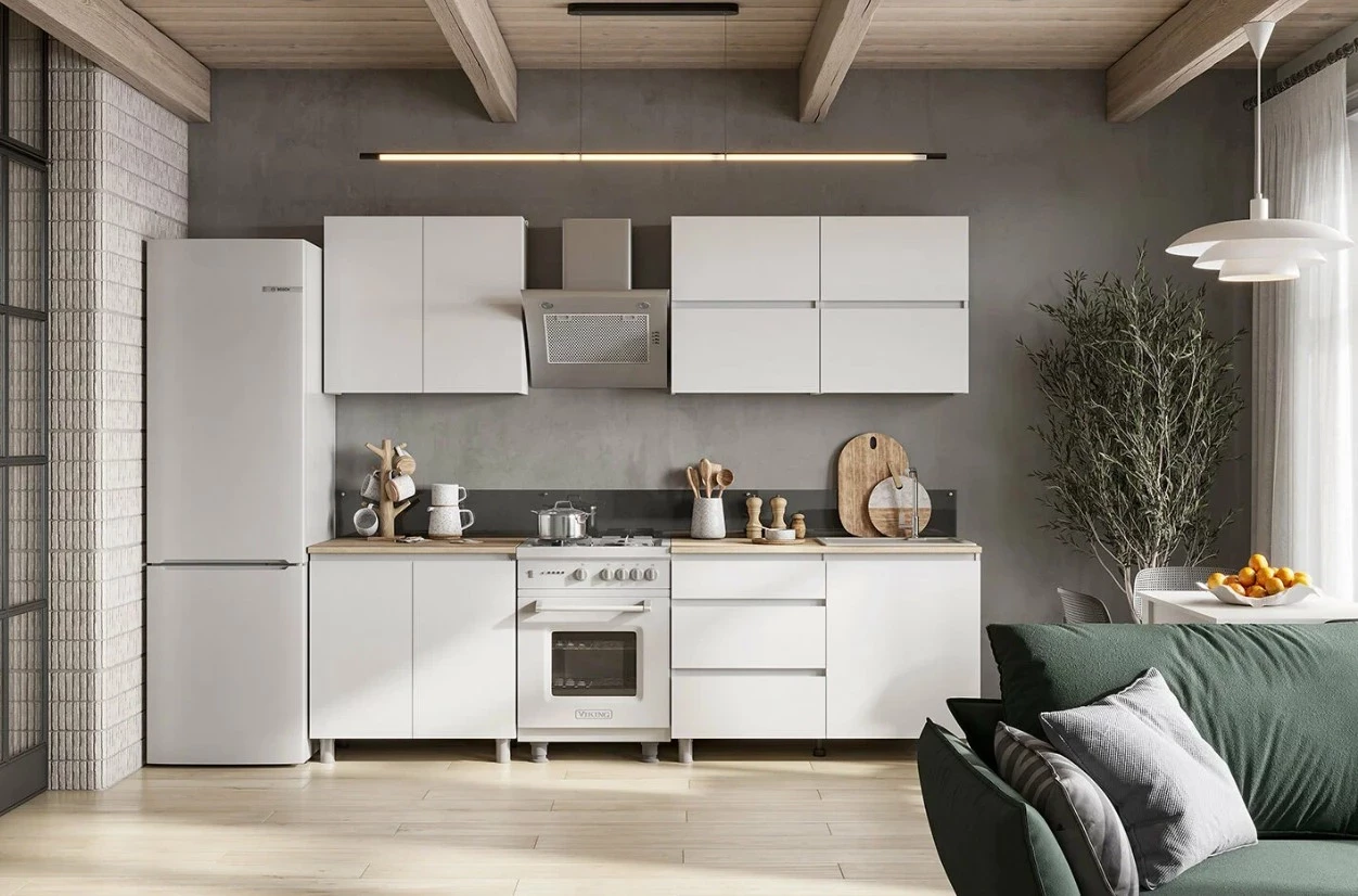 Кухонный гарнитур Hoff в белом цвете с фасадами «белый софт» — грамотное решение для тех, кто ищет баланс между стилем, функциональностью и бюджетом. Компактная длина в 240 см при разумной глубине модулей позволяет рационально использовать даже небольшое пространство. Гарнитур включает верхние и нижние шкафы, а также тумбу под духовой шкаф — идеальный набор для базовой кухни. Отличный пример того, как выбрать мебель для кухни, чтобы получить максимум за разумные деньги.