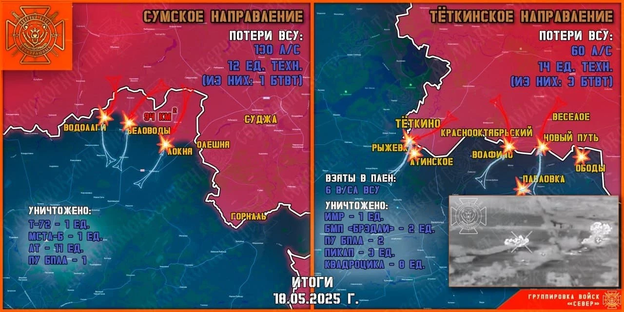 «В результате нашего огневого поражения по вскрытым позициям противника в Сумской области враг понес потери в живой силе, в том числе среди наиболее подготовленных операторов БПЛА из ССО. На Тёткинском и Глушковском направлениях за сутки уничтожено 14 единиц вражеской техники. На Сумском направлении наши штурмовики продолжают продвигаться вглубь украинской территории, выполняя задачу по созданию полосы безопасности. Подразделения ВДВ „северян“ в ходе ожесточенных боев продвинулись в районе села Беловоды и в самом населенном пункте. Наши штурмовые подразделения мотострелков продолжают наступательные действия в приграничных лесных массивах: продвинулись свыше 350 метров, закрепляются. Инженерными подразделениями „северян“ за сутки обнаружено и обезврежено 4818 взрывоопасных предметов. Общее продвижение „северян“ на Сумском направлении составило свыше 650 метров», - проинформировал «Северный ветер».