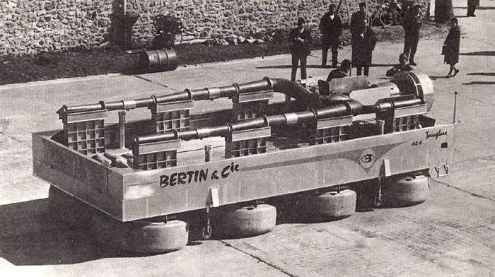 Terraplane BC4 совсем не походил на транспортное средство для дорог общего пользования. Это была грузовая платформа, размещенная на восьми гибких юбках или фартуках, в которые нагнетался воздух. Всё это хозяйство приводилось в движение реактивным двигателем Turbomeca Marbore. Уникальность конструкции Жана Бертена заключалась в этих самых фартуках, которые могли наклоняться в любую сторону. Угол наклона был небольшой, но он позволял машине на воздушной подушке разгоняться до нескольких десятков километров в час. При этом судно парило над поверхностью на высоте 3-4 см. Получался корабль со своеобразной системой изменяемого вектора тяги.