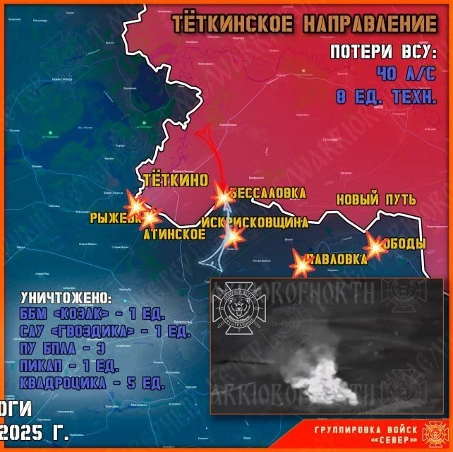 Анализ некрологов показал, что на данном участке фронта также действуют группы военнослужащих 33 ошп ВСУ, которых прикомандировали свыше месяца назад к 225 ошп, держали в резерве на Краснояружском направлении, а затем перебросили для участия в "Тёткинской провокации".