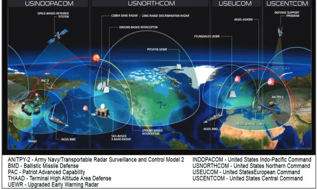 Изображение, дающее общее представление о сферах охвата, обеспечиваемых нынешними элементами противоракетной обороны США на территории Соединённых Штатов и в других странах мира