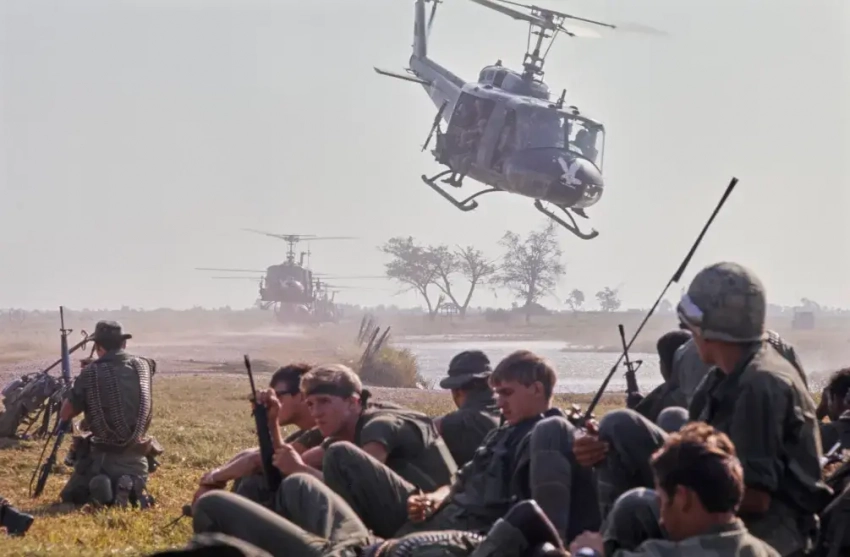 Солдаты 3-го батальона 9-й пехотной дивизии армии США ожидают посадки на вертолёты UH-1 на равнине Рид во время операции в Тан Ане, Южный Вьетнам, январь 1970 г.