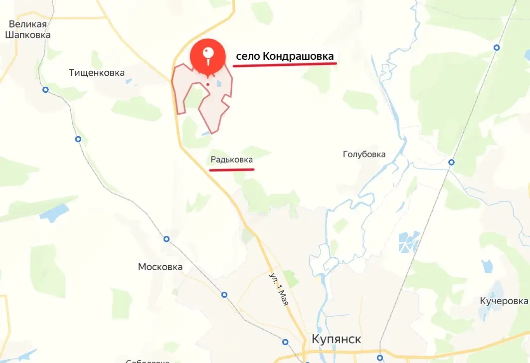А всего за неделю наши военнослужащие освободили 13 населенных пунктов. Расположенное недалеко от Кондрашовки село Радьковка перешло под контроль российской армии 23 мая. Освобождение этих двух населенных пунктов открывает нашим подразделениям с севера прямую дорогу на Купянск. От Радьковки до окраин города остался примерно один километр.