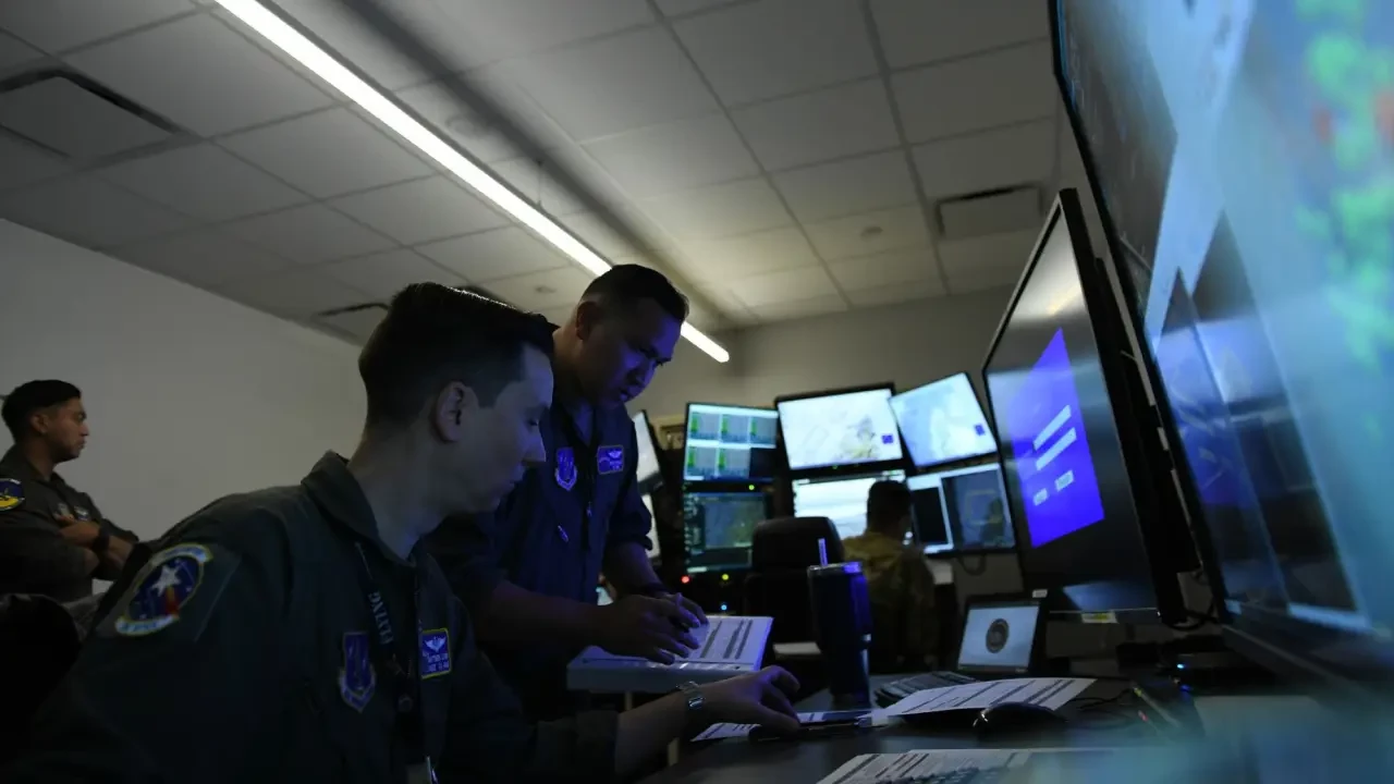Главный сержант ВВС США Мэтью Линн и майор Анджело Тапалла, 196-я штурмовая эскадрилья, Национальная гвардия ВВС Калифорнии, изучают детали тактического сценария во время учений Reaper Smoke, авиабаза резерва ВВС Марч, Калифорния, 23 апреля 2025 года