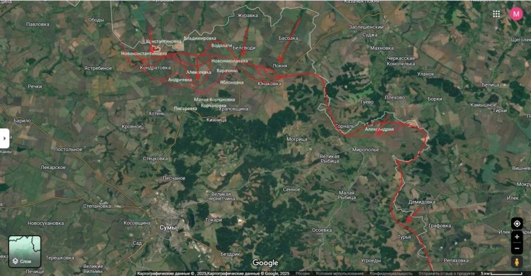 По данным Юрия Подоляки, наступательная операция ВС России продолжается севернее Сум. Накануне бойцы армии РФ смогли установить контроль над двумя населёнными пунктами - Варачино и Новоконстантиновкой.