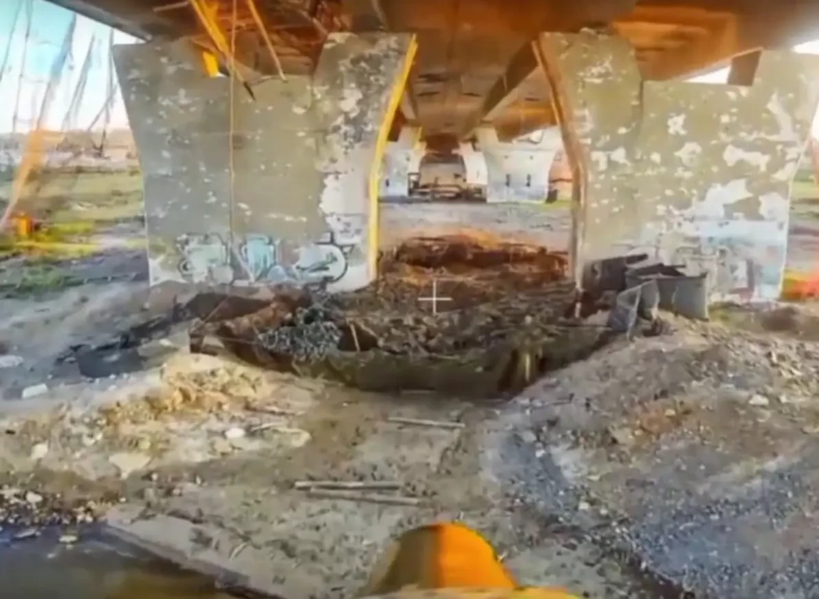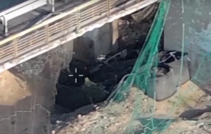 В ролике демонстрируются кадры объективного контроля с российского дрона, операторы которого обнаружили два накрытых маскировочной сеткой плавсредства под одной из уцелевших опор бывшей переправы через Днепр в Херсонской области. Что характерно, укрытие противник сделал основательное, затянув место схрона рыболовными сетями.