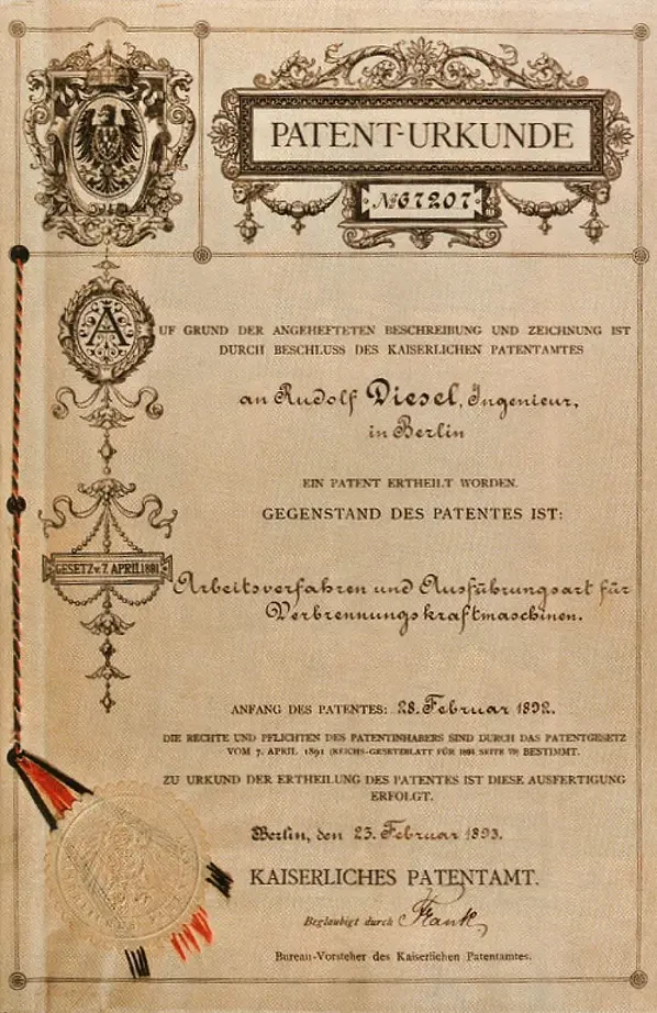 27 февраля 1892 года инженер Рудольф Дизель, работая уже в Аугсбурге, подал заявку на патент «Рабочий процесс и конструкция двигателей внутреннего сгорания». 23 февраля 1893 года Императорское патентное бюро в Берлине нотариально заверило патент инженера под номером 67207.