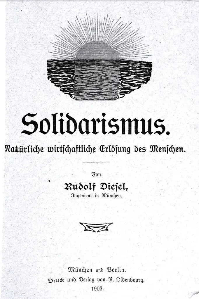 В 1903 году Дизель издаёт книгу «Солидаризм: экономическое спасение человека» тиражом в 10 000 экземпляров. Он был уверен, что весь тираж будет мгновенно раскуплен, ведь имя автора широко известно не только в Европе, но и за её пределами, да и социальные темы, освещённые в книге, были довольно прогрессивны в то время. На этот труд он инвестировал три года жизни и приличную сумму денег, которая должна была сторицей окупиться, но и здесь Дизель-писатель потерпел фиаско – всего было продано, а частично и просто подарено, только 300 экземпляров.