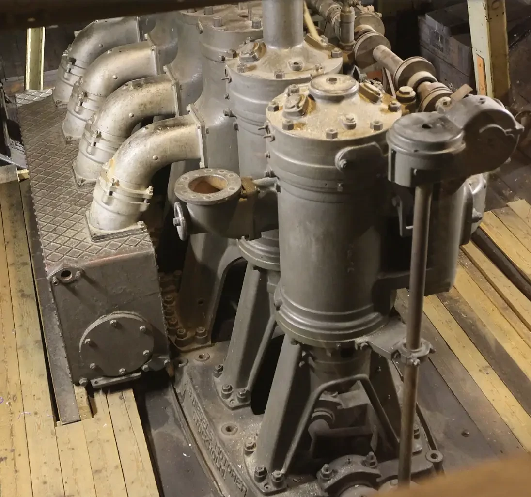 Один из 5-сильных моторов Дизеля. За ним виден баллон с жатым воздухом, обеспечивавшим вспрыск топливной смеси под давлением в 59,22 атм.