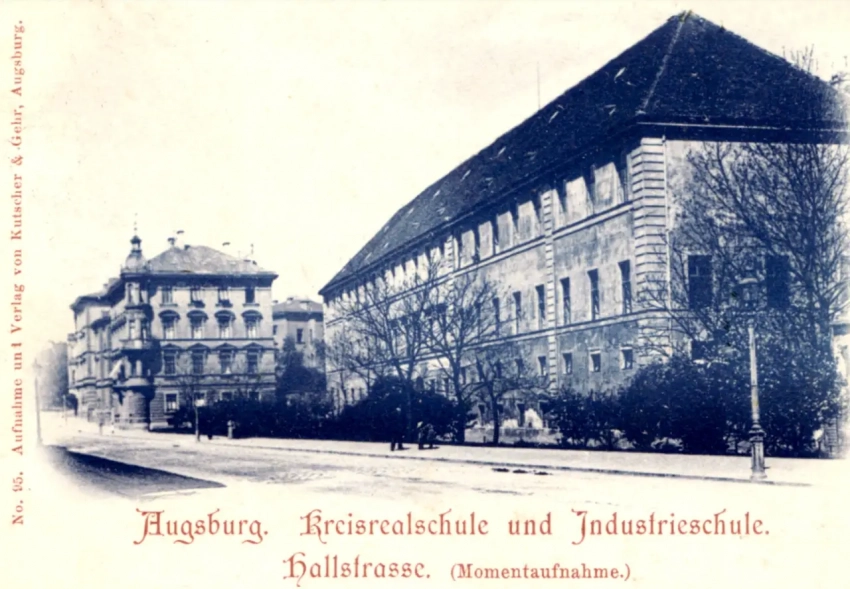 Надпись под фотографией: Аугсбург. Окружная реальная и индустриальная школа. Нальштрассе. (Моментальная фотография)