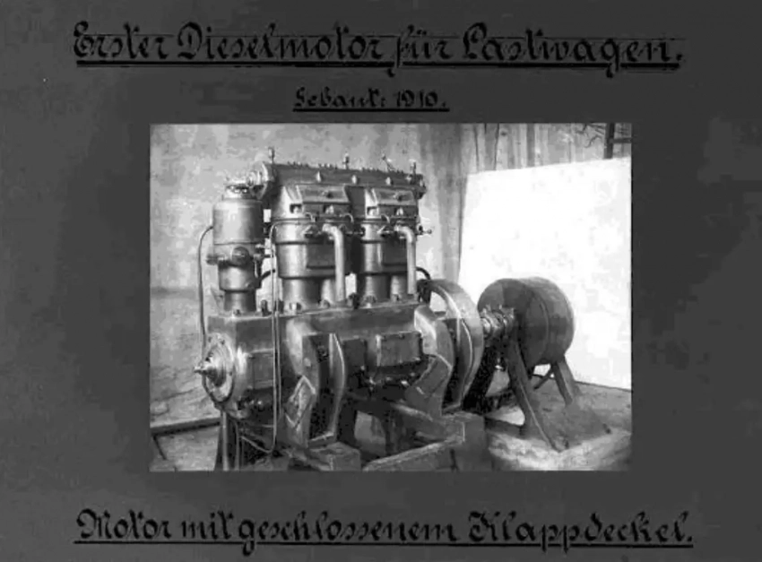 Опытный экземпляр первого четырёхцилиндрового дизеля с водяным охлаждением, сконструированного специально для грузовых машин. Фотография 1910 года.