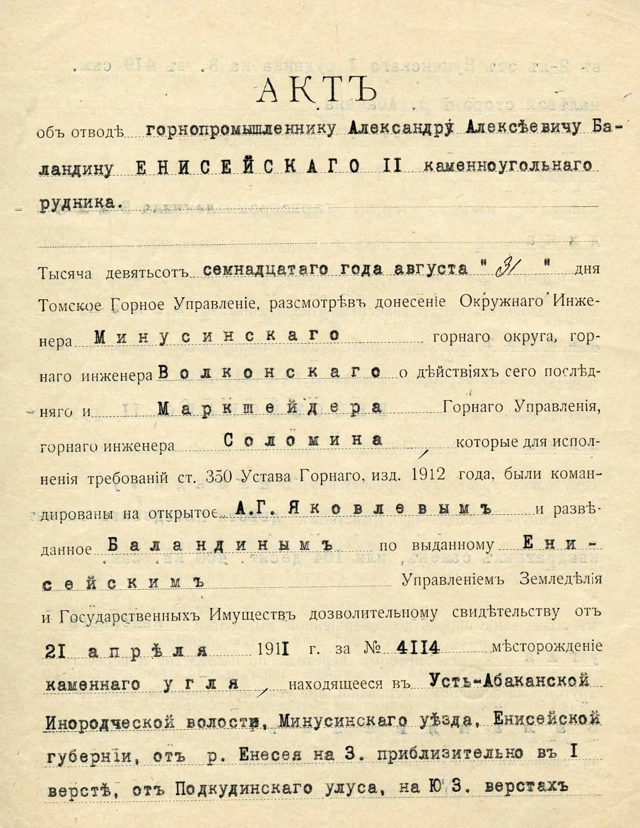 Акт об отводе Енисейского каменноугольного рудника, находящегося в Усть-Абаканской инородческой волости. КККМ ОФ 12376/5