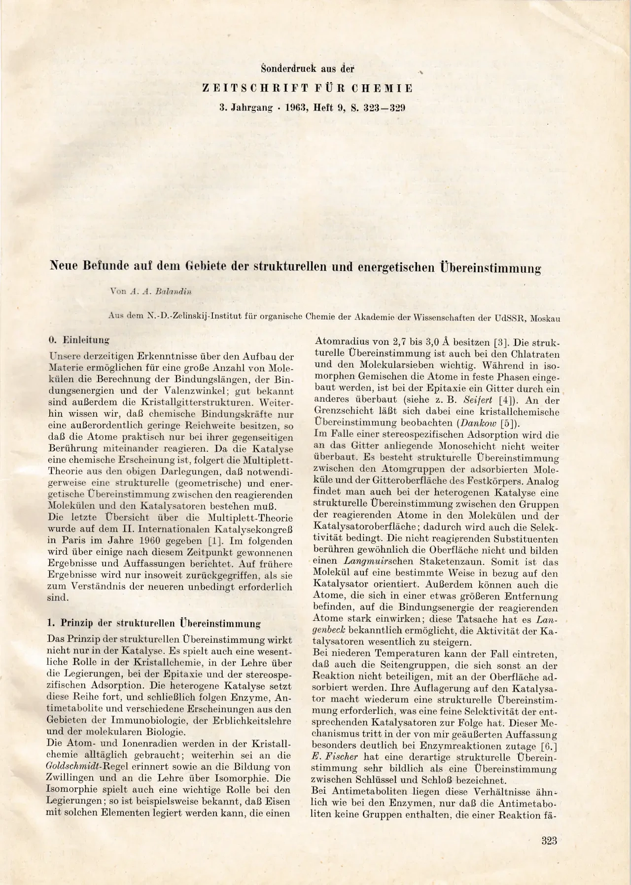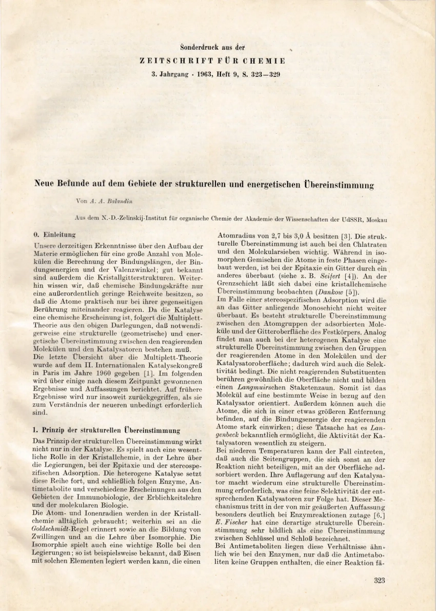 Оттиск статьи Баландина А.А. «Новые данные из области структурного и энергетического соответствия». КККМ ВФ 8765/39