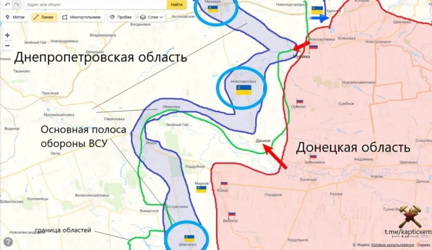 На Новопавловском направлении в Новопавловке противник планирует остановить наше наступление в глубину Днепропетровской области. Сюда откатываются части разгромленных бригад ВСУ и занимают подготовленные укрепления. В предполье рвы и препятствия, далее рубеж первой линии домов жилого сектора, в глубине населенного пункта оборона опирается на реку Соленая. ВС РФ ведут активное наступление с севера на Муравку, на выезде из которого огромный опорник и с юга на Дачное, перед этим очень быстро сломив сопротивление врага в Новоукраинке и Зеленом Куте. Как будут развиваться события сказать точно невозможно, но слабое звено в построении это южный участок фронта между Мирное и Дачное.