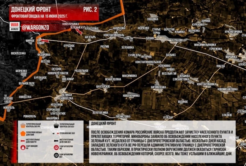 На Донецком фронте после освобождения Комара российские войска продолжают зачистку населенного пункта и прилегающих территорий. Минобороны заявило об освобождении населенного пункта Зеленый Кут, недалеко от границы с Днепропетровской областью. Несколько дней назад западнее Зеленого Кута ВС РФ перешли административную границу с Днепропетровской областью. Таким образом, в практически полном окружении должен оказаться гарнизон Новоукраинки, об освобождении которой, скорее всего, мы тоже услышим в ближайшие дни.