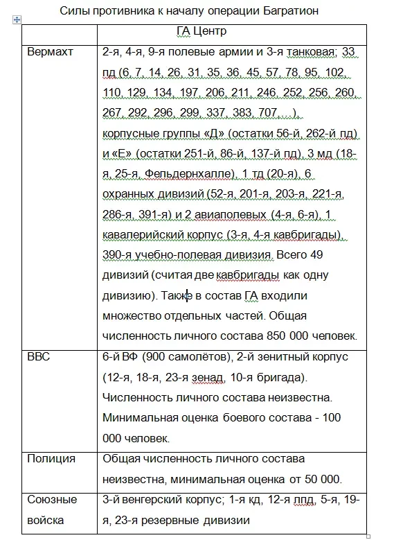 Эта таблица является наглядным примером того, как должен выглядеть полный учёт немецких сил. Подобных данных по немецким силам в полосе операции «Багратион» нет. Но такие сведения необходимы для полного учёта немецких сил в операции.