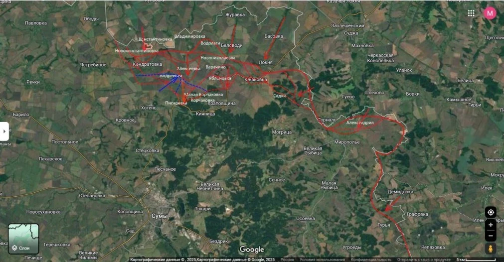 На Сумском направлении, которое остаётся одним из приоритетных для ВС РФ, продолжаются ожесточённые встречные сражения. Противник, перебросив резервы, включая 225-й штурмовой полк из района Тёткино, пытается контратаковать российские позиции севернее Хотени. Основные бои разворачиваются между Андреевкой и Алексеевкой.
