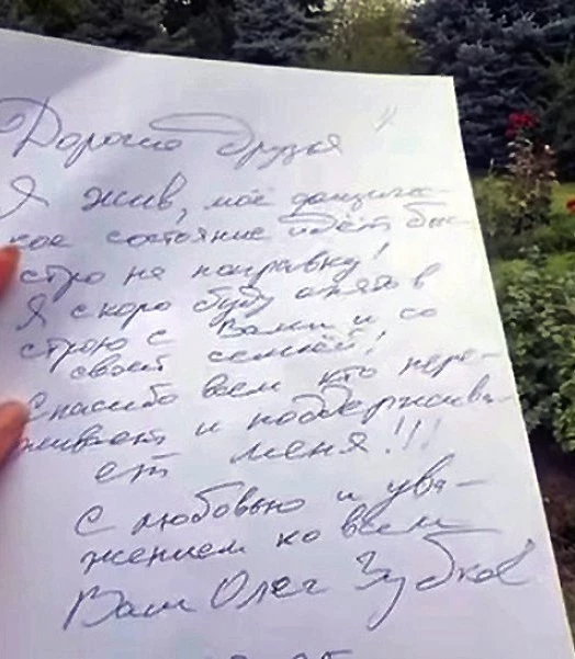 «Дорогие друзья. Я жив, мое физическое состояние идет быстро на поправку. Я скоро буду опять в строю с вами и со всей своей семьей. Спасибо всем, кто переживает и поддерживает меня. С любовью и уважением ко всем. Ваш Олег Зубков».