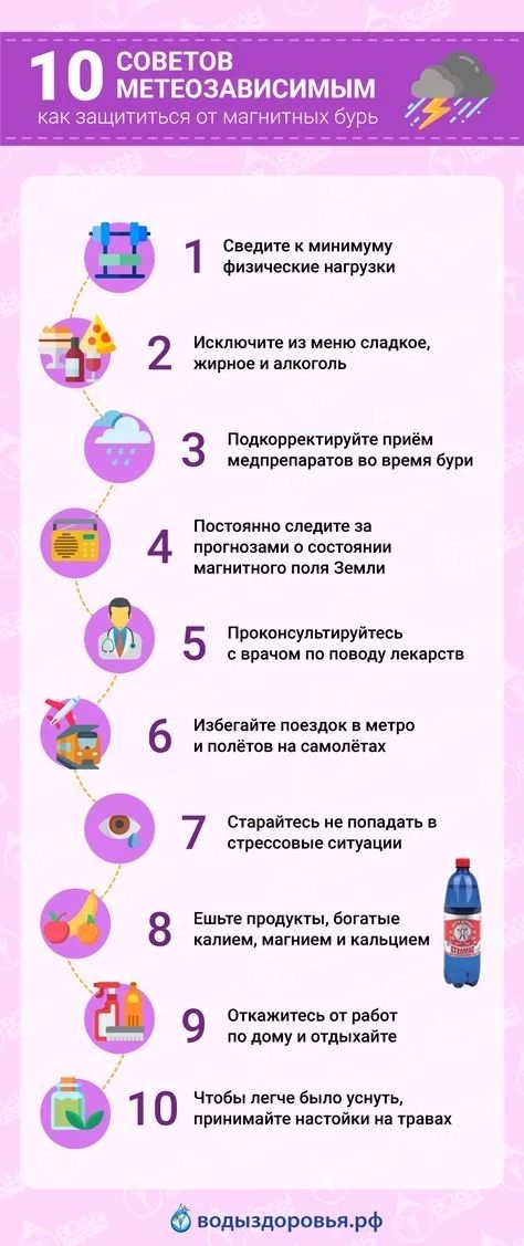 Тем, кто чувствует на себе погодные и климатические изменения, врачи советуют пить больше воды. Также стоит отказаться от употребления соленых продуктов, поскольку соль вызывает повышение артериального давления и задерживает жидкость в организме.