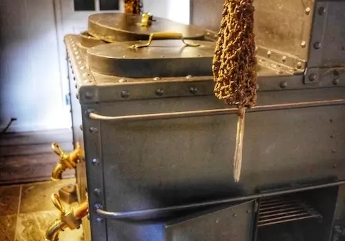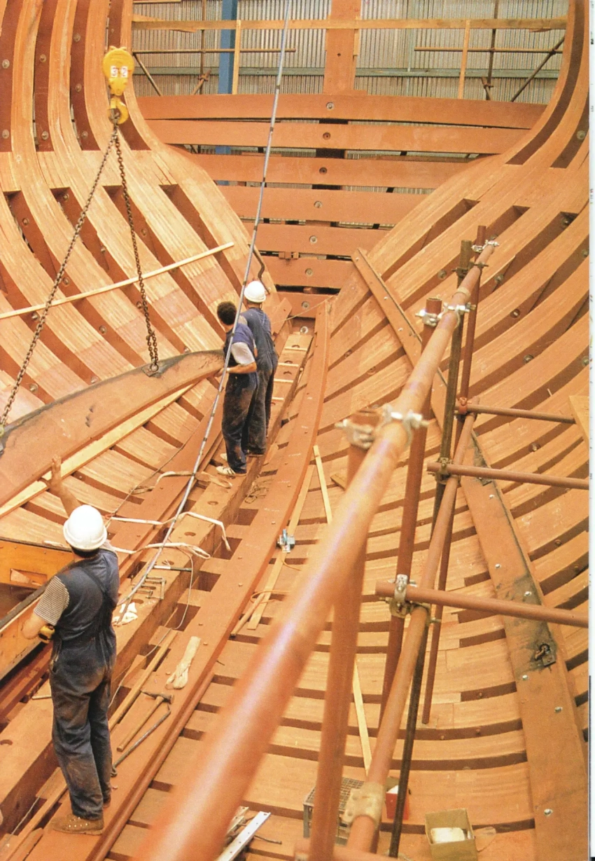 Так как приобрести бревна достаточной длины было затруднительно, то киль, шпангоуты и многие другие части корпуса собирались из так называемой «ламинированной древесины», то есть распиленной на тонкие доски, а затем склеенной до необходимых размеров. Следует отметить, что прочность таких «бутербродов» была выше, чем у цельной древесины.