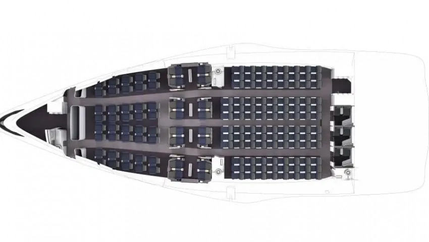 Представленная конструкция салона включает 9 рядов в эконом-классе с шагом 78,74 см, 5 рядов в первом классе с шагом 96,52 см и центральную зону, в которой могут разместиться 4 семейных сиденья в клубном стиле или 4 ряда сидений, с шагом 86,36 см.