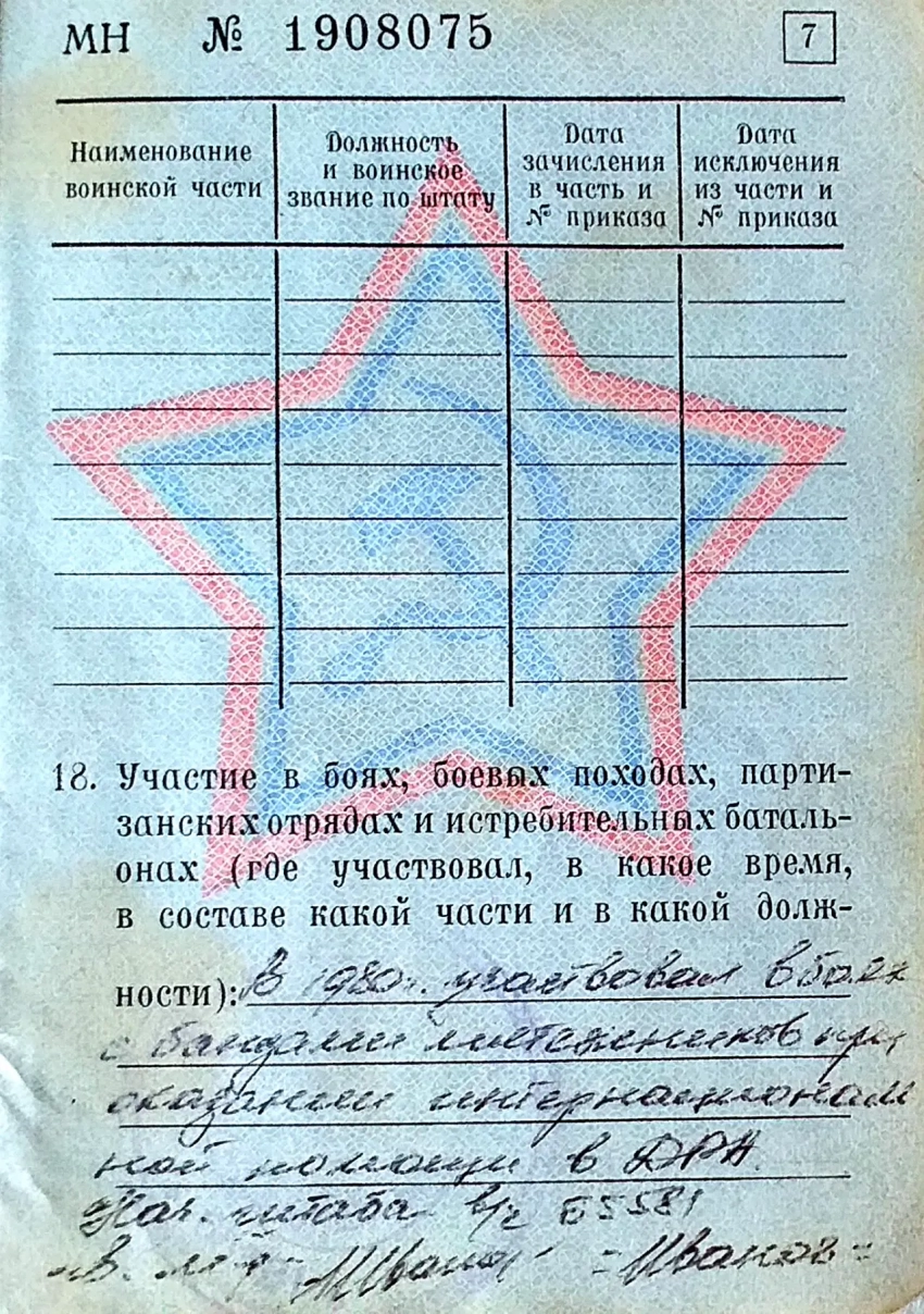 Что касается утверждения о том, что боевые действия не ведутся, то до своей гибели в мае 1980 года наш начальник штаба полка, гвардии майор Иванов, успел сделать запись в наших военных билетах на 7-й странице: «В 1980 году участвовал в боях с бандами мятежников при оказании интернациональной помощи в ДРА». Полковая печать и подпись: начальник штаба в/ч 65581, гвардии майор Иванов.