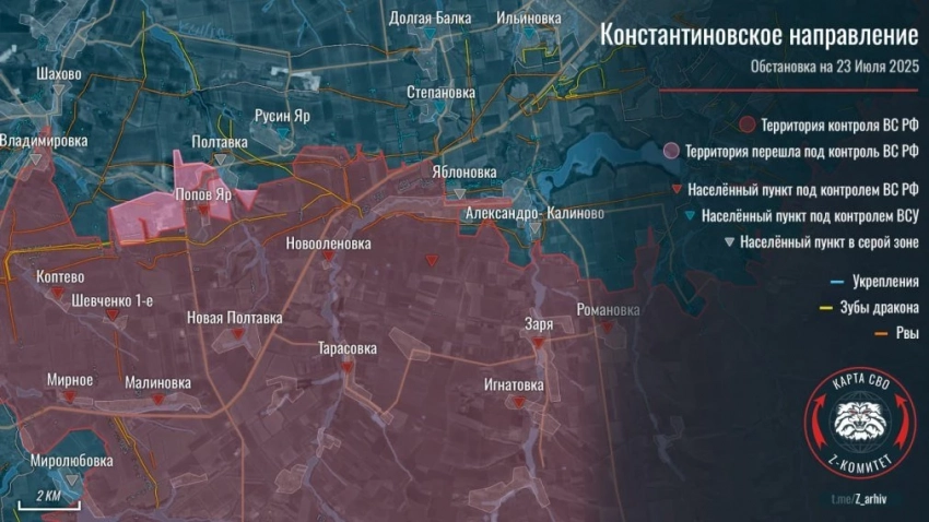 Ожесточённые бои продолжаются и на Константиновском направлении. Подразделения ВС РФ укрепляют свои позиции в Яблоновке, с юга наступают на Александро-Калиново, продолжают боевые действия в Дылеевке.