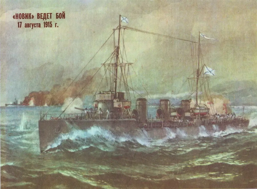 Не менее интересно, что «Новик» 17 августа в одиночку вступил в бой с двумя своими немецкими «клонами» — V-99 и V-100 в Рижском заливе. И вышел победителем! Русские 102-мм пушки оказались лучше немецких 88-мм орудий, стоявших на «зерстрорерах», V-99 получил повреждения настолько серьёзные, что лишился хода и был снесён на мины, после чего его история трагически завершилась. История остальных завершилась самозатоплением в Скапа-Флоу.
