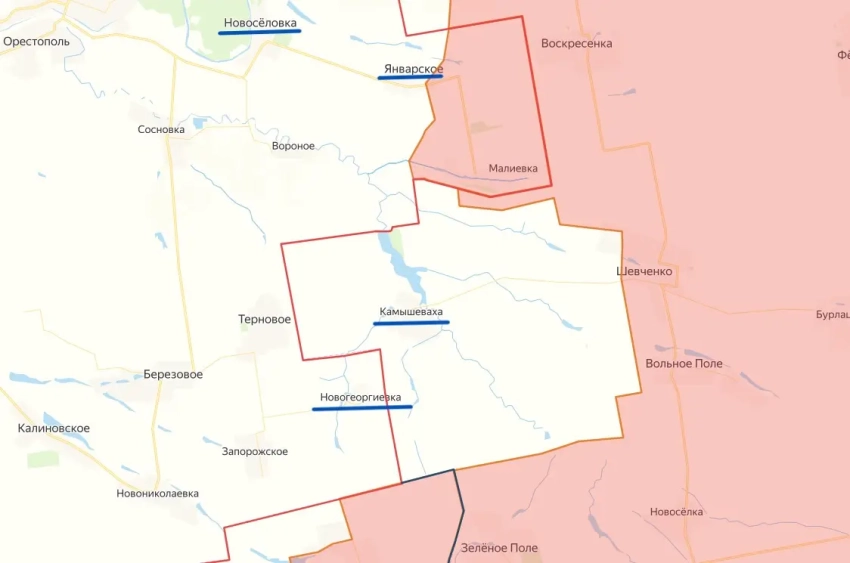 Сейчас наши войска продвигаются в направлении Новогеоргиевки, расположенной недалеко от границ Донбасса. Таким образом, ВС России подступают с юго-запада к группировке противника, обороняющей Камышеваху.