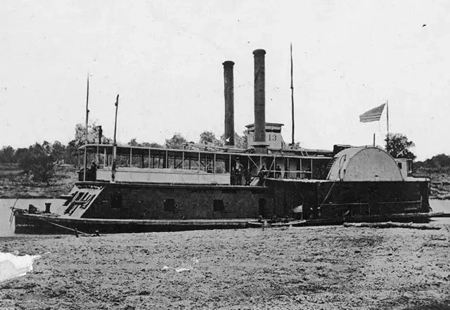 Гравюра по эскизу Теодора Р. Дэвиса, опубликованному в журнале «Харпертс Уикли» в 1863 году, изображает операцию 25 февраля 1863 года, в ходе которой ВМС США спустили на воду по реке Миссисипи фальшивый броненосец (слева), из-за чего конфедераты уничтожили захваченный броненосец «Индианола». «Королева Запада» изображена справа». Корабль был затоплен у острова Пальмира