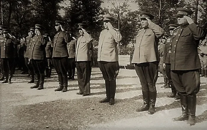 Маршалы К. А. Мерецков (4-ый справа), Р. Я. Малиновский (3-ий справа), А. М. Василевский (2-ой справа) и сопровождающие их генералы на русском кладбище в Порт-Артуре