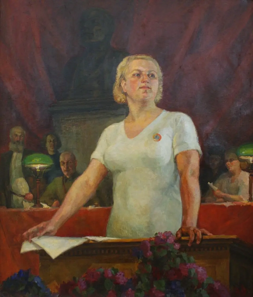 Художник Л. Ждановская. «Выступление стахановки», 1940 г.