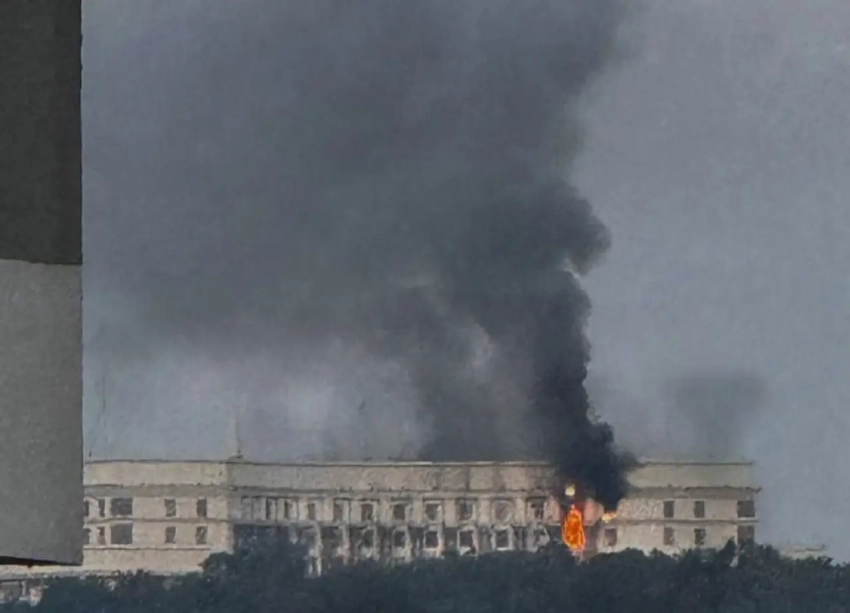 Очаг пожара находится на 9-м этаже. При этом пламя активно распространяется, охватывая и верхний этаж правительственного здания.