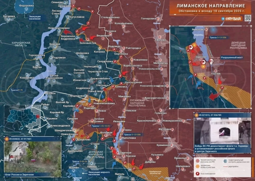 ▪️ На Краснолиманском участке ожесточённое сражение за Заречное. ВС РФ усилили давление на силы противника с севера и юга. В районе Шандриголово наши части стараются обойти село с флангов и ведут бои севернее Дерилово. В районе с. Среднее наши войска начали двигаться на Коровий Яр. Ряд источников сообщает о боях в районе Ямполя, ждём подтверждения.