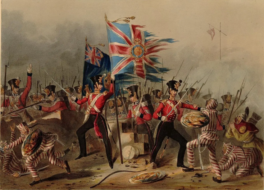 Британцы решили преследовать отступающих, но в сельской местности успехи у них были значительно жиже, более того, 29 мая толпа из 20 тысяч китайских крестьян с ножами и самодельными пиками окружила отряд из 60 сипаев, загнала их на рисовые чеки и осаждала там два часа, убив четверых и ранив порядка 20 человек. Когда на помощь сипаям пришло подкрепление, солдаты смогли отступить в захваченный накануне форт, который также был осаждён крестьянами (китайские источники уверяют, что один из солдат изнасиловал жену местного жителя Вый Шаогуана, потому крестьяне так и взбеленились). Генерал Хью Гоф, главнокомандующий британскими войсками в Китае, направил сообщение губернатору Гуанчжоу Юй Баочуню, что если толпа не разойдётся, то он сравняет Кантон с землёй, и тот призвал крестьян разойтись. Мелкий эпизод, но в современном Китае его раздули до полноценного национального мифа: народное сопротивление захватчикам и трусливый цинский чиновник, призывающий героических крестьян разойтись...