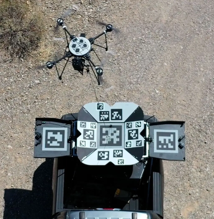 На элементах площадки и на крышке корпуса имеются двухмерные коды стандартов QR и AprilTag. Эти метки должны использоваться рекомендуемыми БПЛА для взлёта и посадки. По ним аппарат способен определять своё положение в пространстве и строить траекторию.