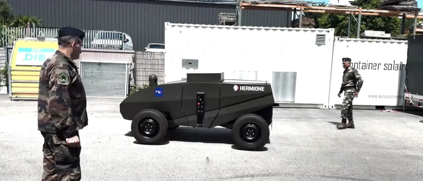 Целью проекта Hermione было создание многоцелевой колёсной платформы с электрической силовой установкой. Источником энергии являются водородные топливные элементы собственной разработки. Шасси с таким оснащением предлагается использовать в качестве базы для РТК разного назначения. Например, на выставке представили комплекс-носитель БПЛА.