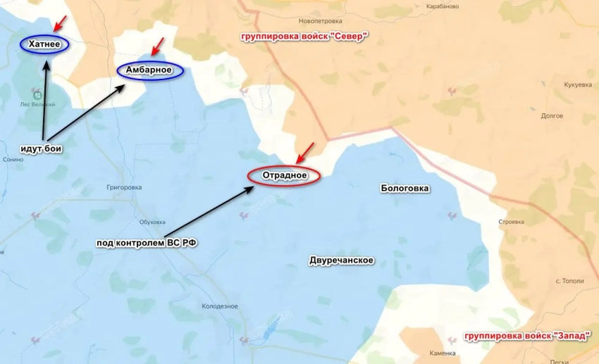 Согласно поступающей информации, российские войска установили контроль над населенным пунктом Отрадное на новом участке фронта, открытом всего несколько дней назад. Подробностей пока нет, сообщается, что после зачистки села наши продолжили движение вглубь Харьковской области. Одновременно с этим штурмовые подразделения «Бесстрашных» вышли к селу Амбарное северо-западнее Отрадного. Это уже участок Меловое — Хатнее.
