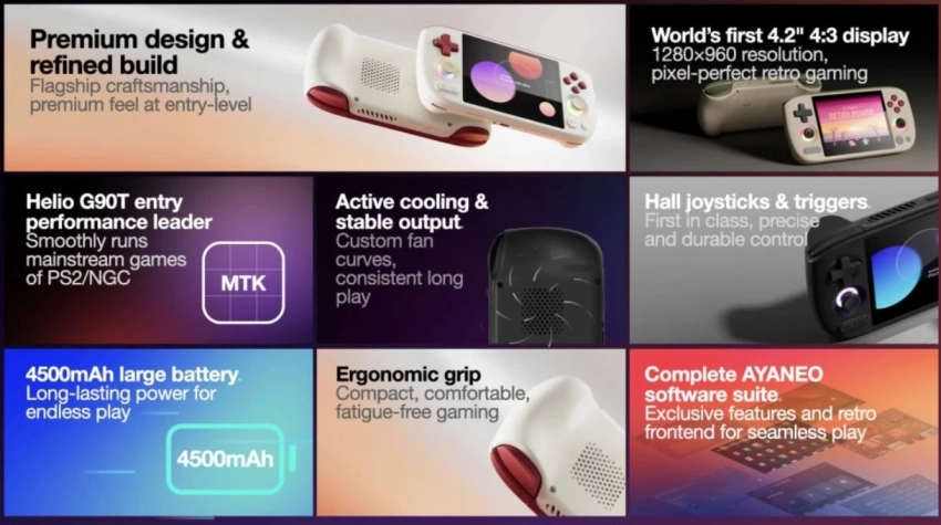 Устройство получило компактный 4,2-дюймовый экран с разрешением 1280×960 и классическим соотношением сторон 4:3 — именно оно идеально подходит для запуска ретро-игр, изначально созданных под такие дисплеи. По дизайну консоль напоминает классические карманные приставки: ничего лишнего, только геймпад с экраном.