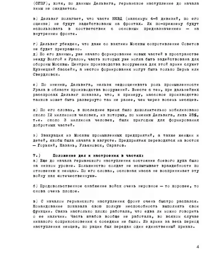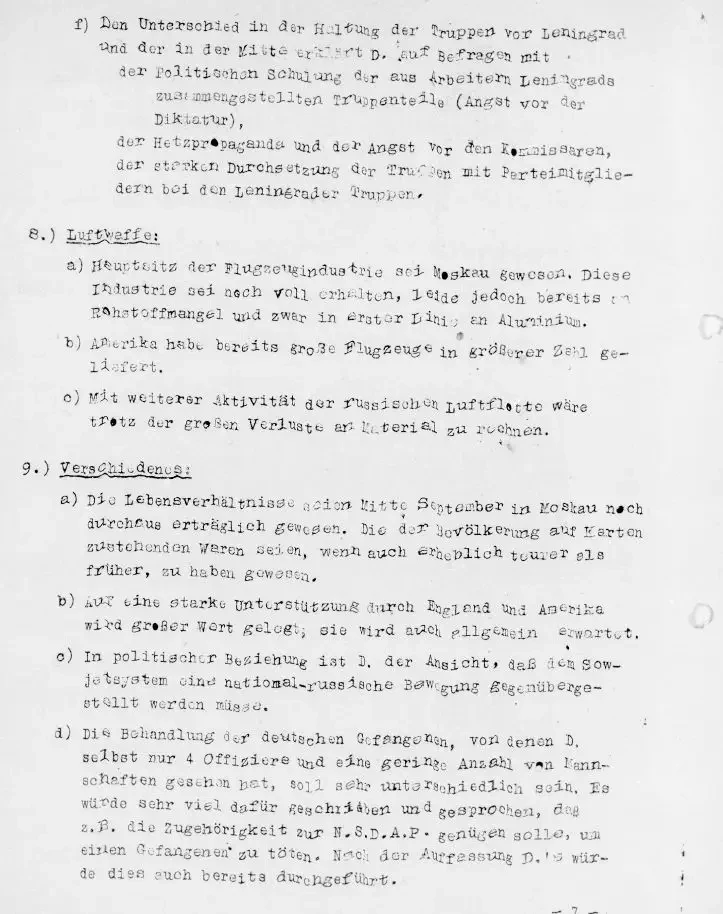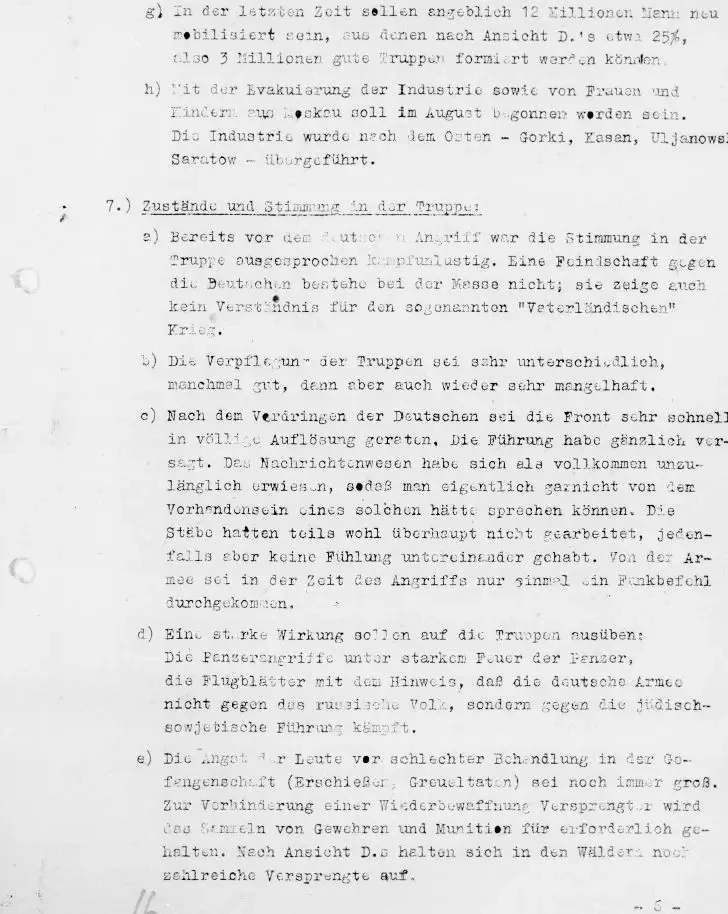 Часть 7 протокола (см. вариант протокола допроса в русском переводе ниже) посвящена полученной из допроса информации о положении дел и настроениях в частях Красной Армии.
