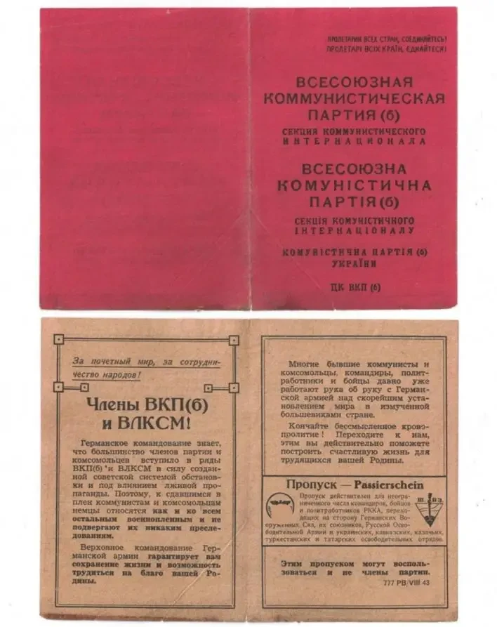 Листовка с призовом к сдаче в плен, замаскированная под партийный билет. Рассчитано на то, что боец Красной Армии не может не поднять лежащий на земле партийный билет