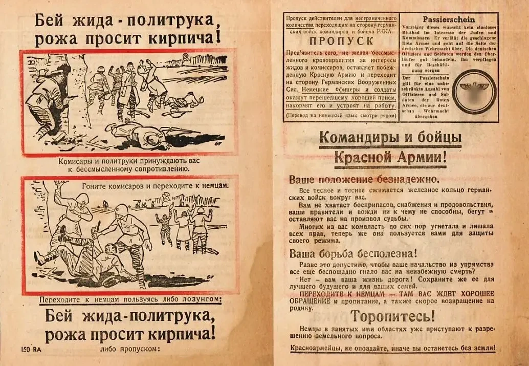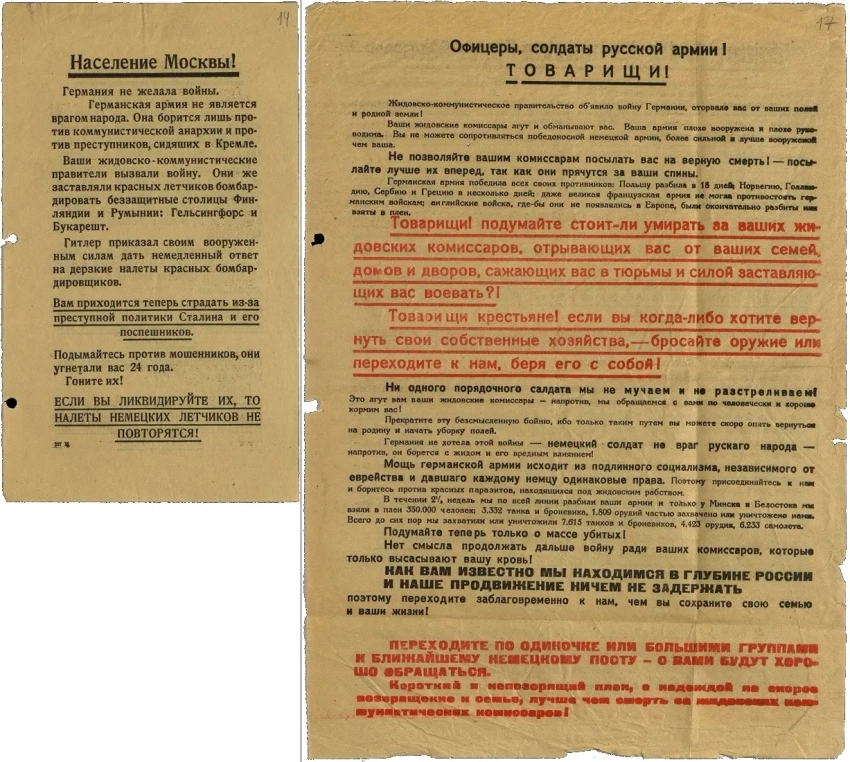 К 22 июня 1941 г. в Германии уже было напечатано 50 млн листовок на русском языке. В состав рот пропаганды вермахта, которые вели пропагандистскую работу против Красной Армии, также вошли носители языка, прежде всего балтийские немцы и иностранные специалисты, которые работали в СССР в годы первых пятилеток.