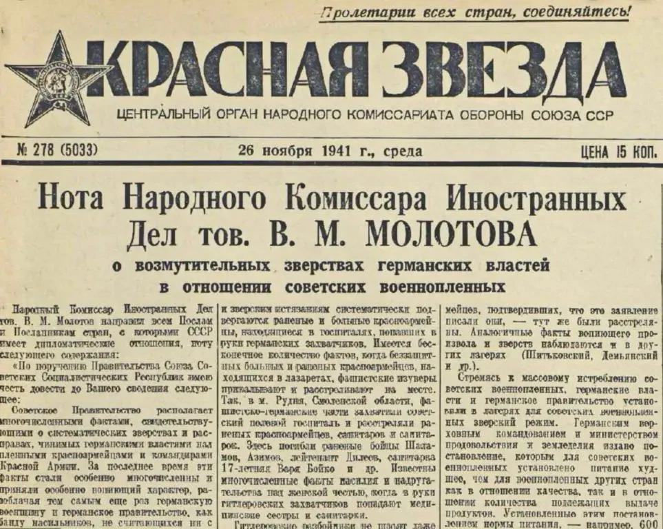 Нота В.М. Молотова от 25 ноября 1941 года. На следующий день была напечатана в советской газете «Красная звезда».