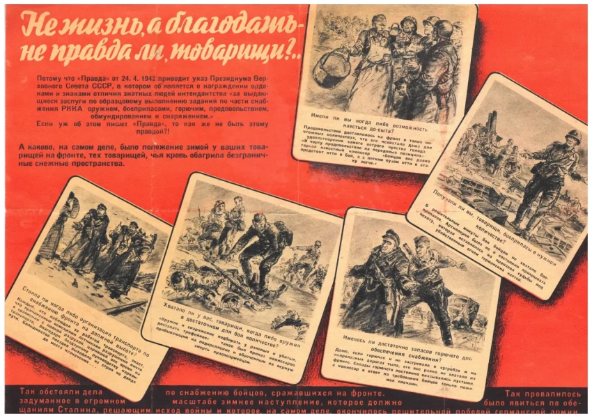 Позже поражение под Москвой, а потом под Сталинградом нанесло тяжелый удар по спецпропаганде вермахта. Скрывать его реальный масштаб можно было какое-то время лишь от населения Третьего рейха и оккупированных областей, но не от бойцов и командиров Красной Армии. Спецпропаганда, не подкрепленная успехами собственных войск, рано или поздно начинает работать вхолостую, так как её потребитель имеет возможность сопоставить обращенное к нему слово врага со своим личным опытом и с тем, что окружает его в настоящий момент.