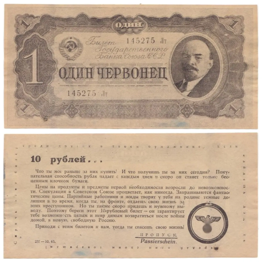 Немецкая листовка, замаскированная под банкноту «один червонец». Предполагалось, что денежную купюру солдат точно заметит и захочет поднять